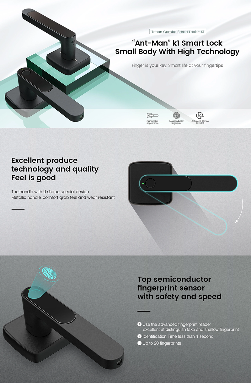 The K1 ANSI smart lock is suitable for ordinary single-door bolt locks, making it easier for you to replace the locks. The use of a standard single latch to install the lock becomes more secure and convenient. Disassembly and assembly are very simple, and the original spherical lock can be directly replaced. Excellent produce technology and quality feel is good. The handle with U shape a special design metallic handle, comfort grab feel, and is wear-resistant.