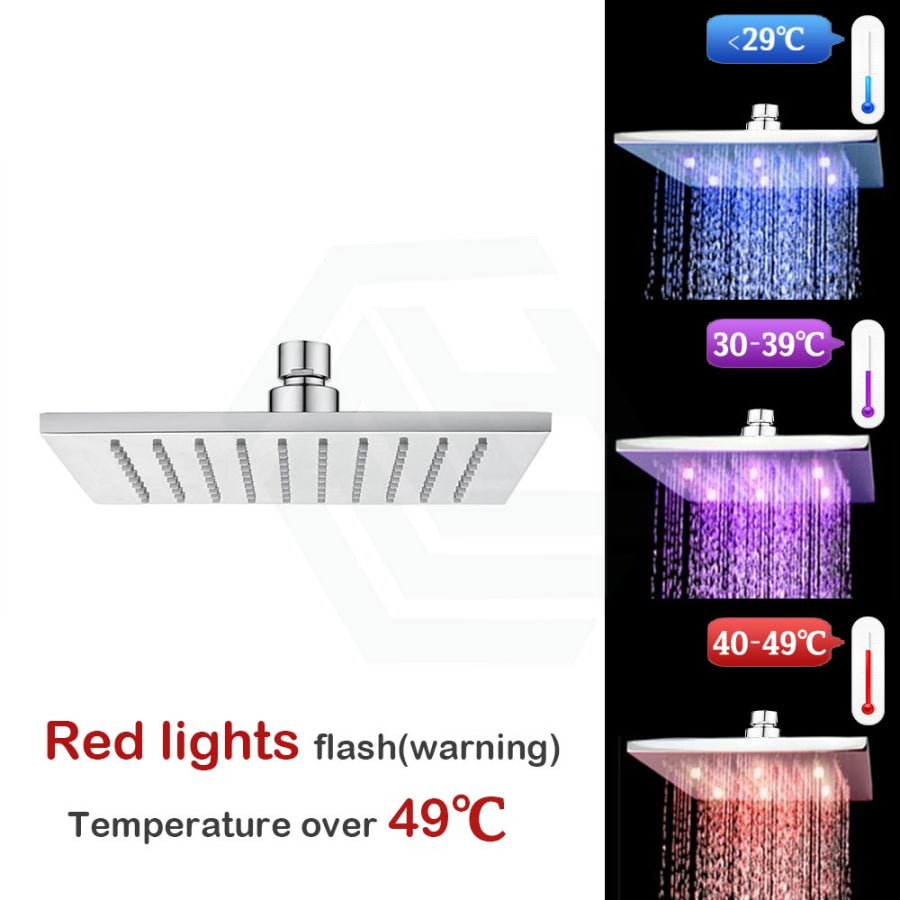 This large 8 inch square LED Rainfall Shower Head allows you to enjoy first class luxury in your very own bathroom. Featuring LED display lights, this modern design rainfall shower head detects the water temperature (blue for cold, violet for warm and red for hot). Made from solid brass with a high grade chrome finish this shower head also boasts WELS approval for water saving and energy saving.