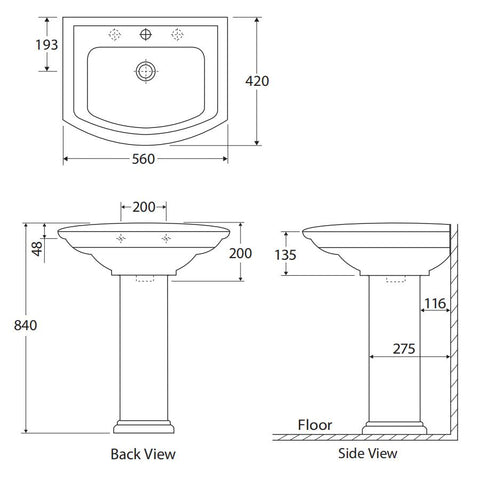 560x420x840mm RAK Washington Pedestal Basin in Gloss White Freestanding 1 or 3 Tap Holes Available