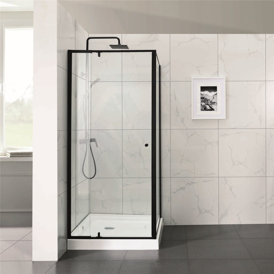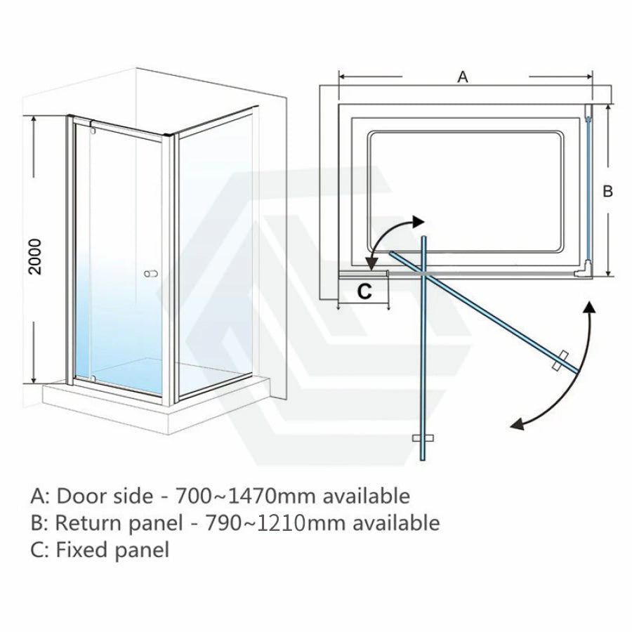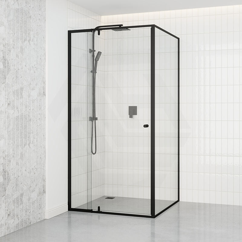 700-1470x2000mm Semi-frameless L Shape Shower Screen Pivot Door with Return Panel Black Fittings
