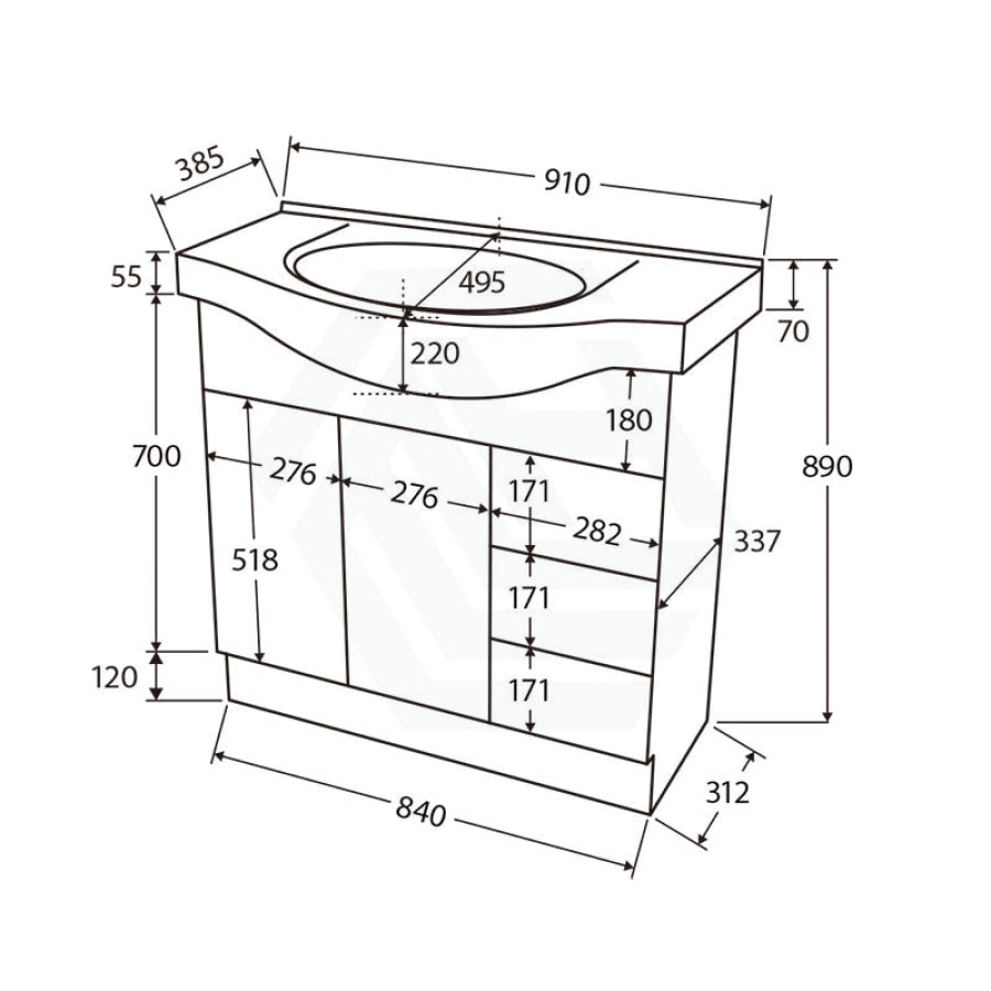Width: 910 mm x Depth: 495 mm x Height: 890 mm
