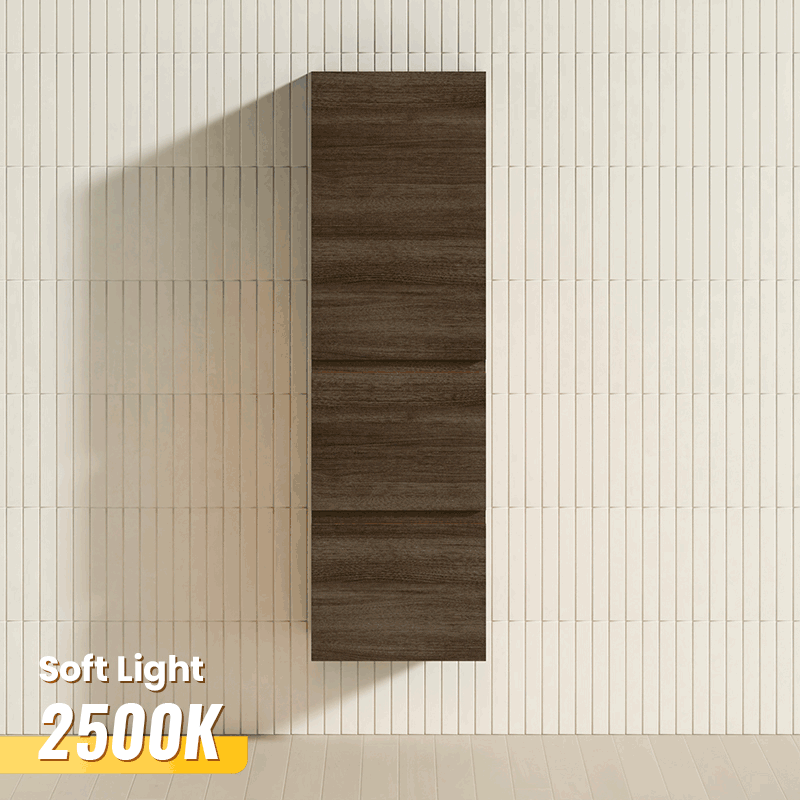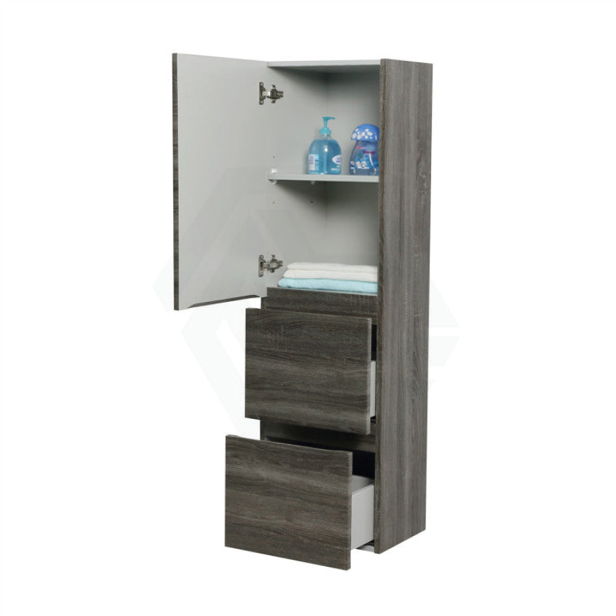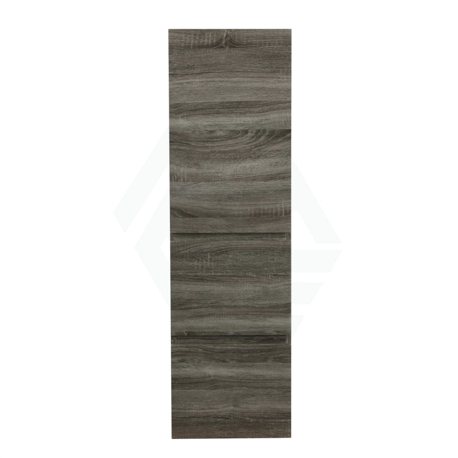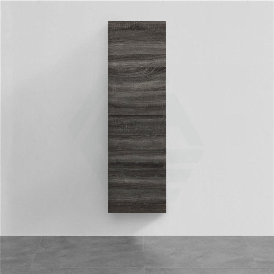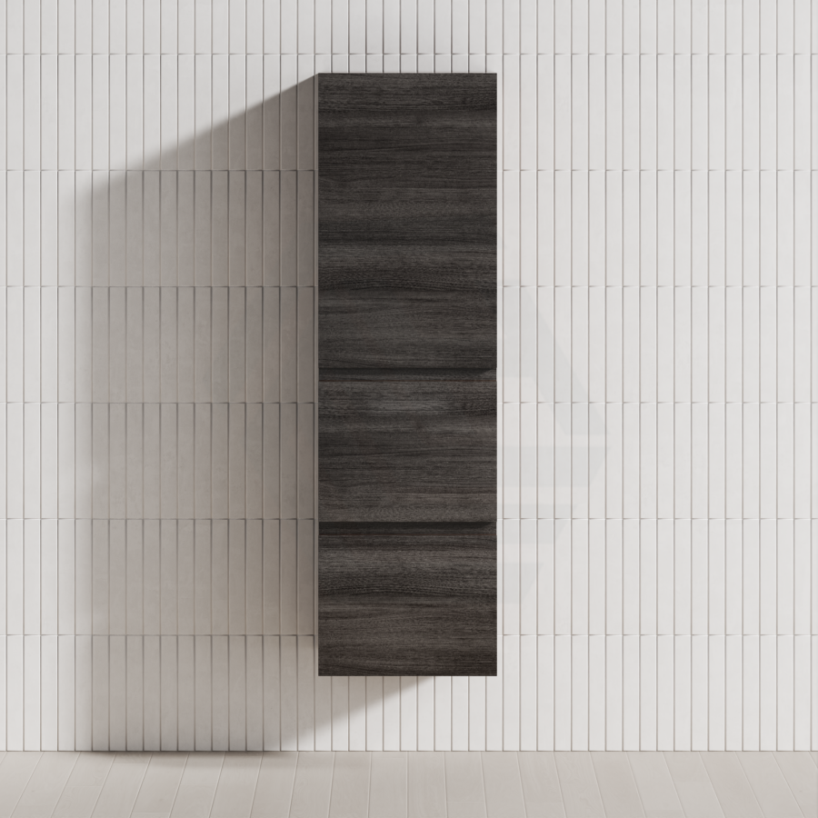 The 400Lx300Wx1350Hmm Berge Wall Hung Bathroom Vanity Tall Boy DARK Grey Wood Grain PVC Filmed brings comfort and function together in the bathroom, equipped with soft closing design.