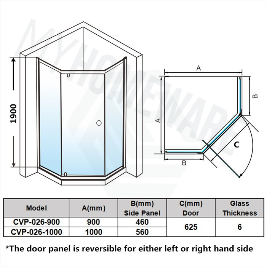 900/1000mm Diamond Shape Shower Screen Pivot Door Chrome Semi-frameless 6mm Glass 1900mm Height