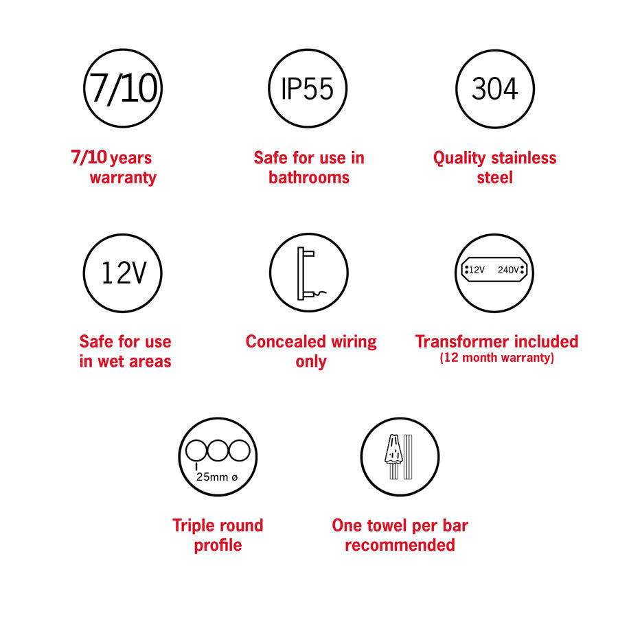 The Thermorail single bar heated towel rails are all 12 volt which means they are safe to be installed anywhere in the bathroom, even close to water. All the 12-volt single bar rails are provided with a transformer in the box. We also recommend the use of a timer to control the rails and save on running costs. One towel per bar recommended.
