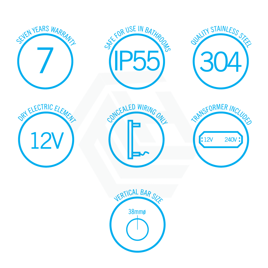 We also recommend the use of a timer to control the rails and save on running costs. One towel per bar recommended.
