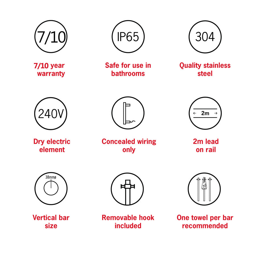 We also recommend the use of a timer to control the rails and save on running costs. One towel per bar recommended.