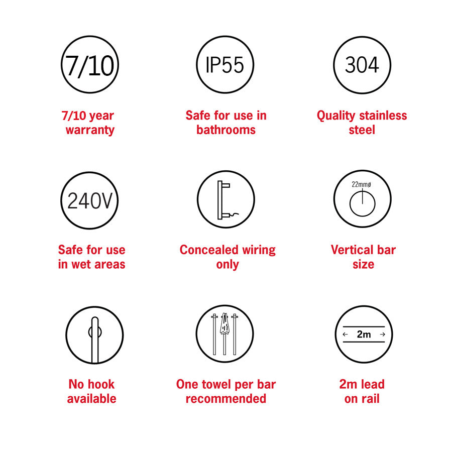 Whilst the vertical rail will assist in drying your towel, it does have less surface contact than a ladder rail and therefore will be less effective in drying and warming your towel than a ladder. We also recommend the use of a timer to control the rails and save on running costs. One towel per bar is recommended.