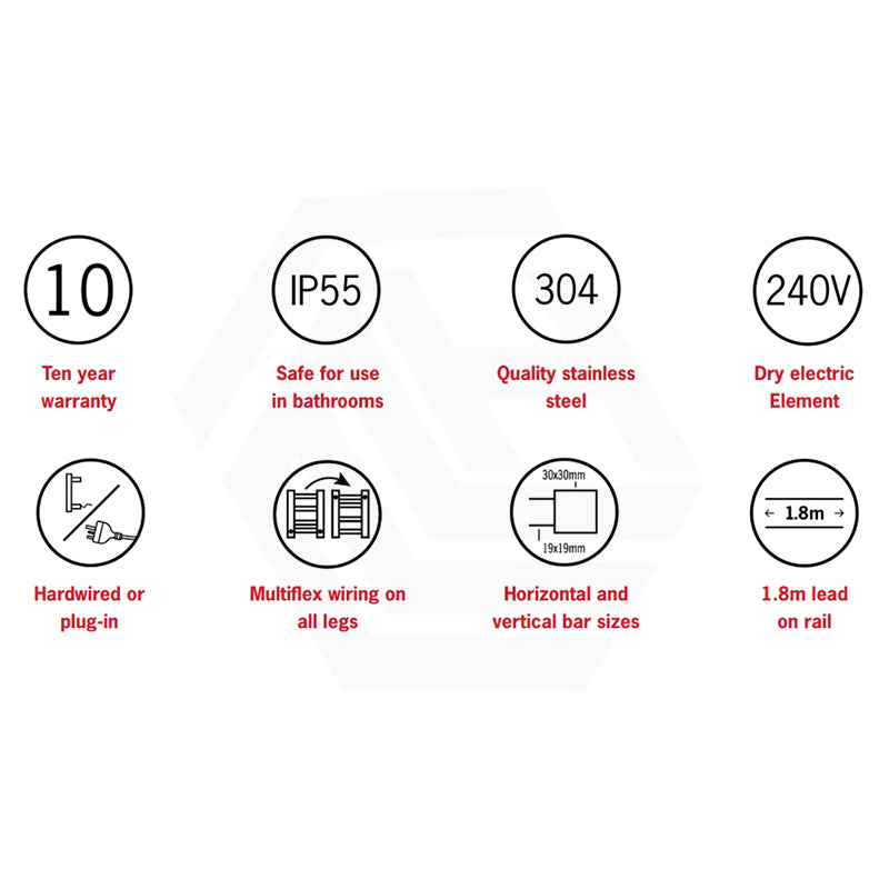 The towel heater features multiflex wiring. This means that you have a connection point on the right or left-hand side of the rail, this would be typically at the bottom but the rail can be flipped so that it is at the top and provides the option of hardwired or plugin, all as standard out of the box.