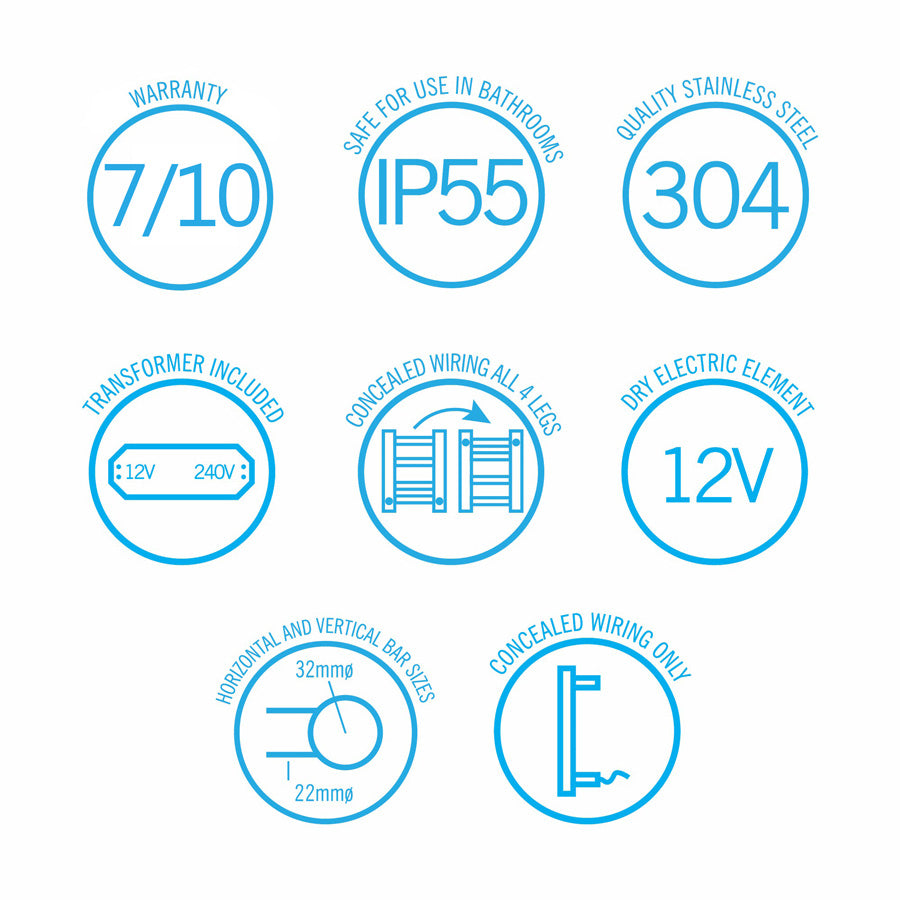 The electric towel dryer is a 12v unit, this means that it can be installed close to a wet area in the bathroom. The rail comes supplied with a transformer which reduces the incoming voltage from 240v to 12v. The rail will still operate at the same temperature and use the same amount of electricity as an equivalent 240v rail as the wattage is the same, however, the rail is operating at a lower voltage.