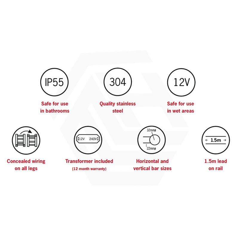 The electric towel dryer is a 12v unit, this means that it can be installed close to a wet area in the bathroom. The rail comes supplied with a transformer which reduces the incoming voltage from 240v to 12v. The rail will still operate at the same temperature and use the same amount of electricity as an equivalent 240v rail as the wattage is the same, however, the rail is operating at a lower voltage.