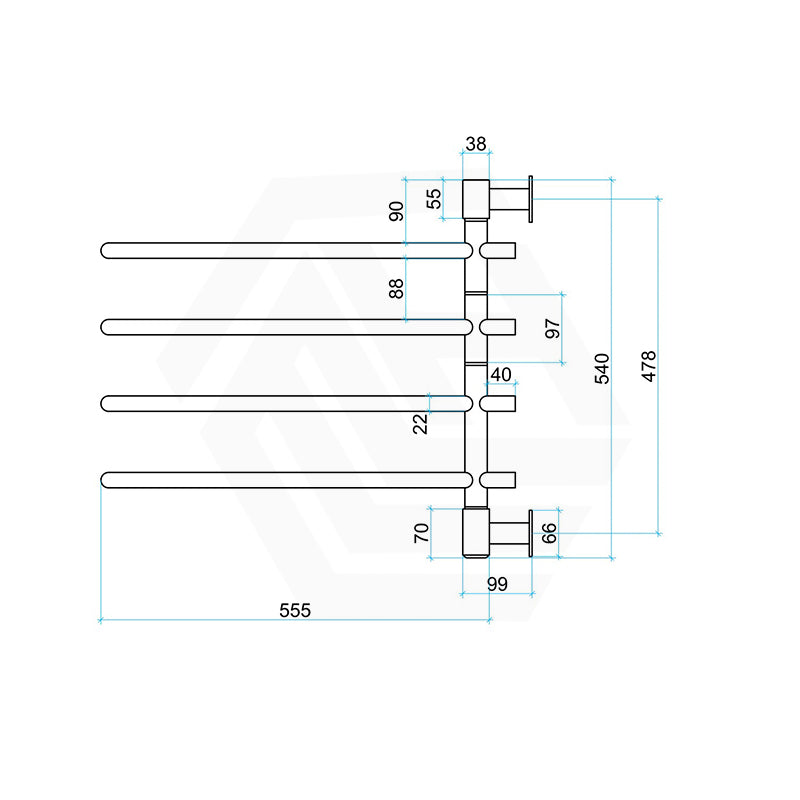 The SV24 towel dryer is able to be swivelled 180 degrees when installed on the wall. Each bar can also be swivelled independently on the rail. The advantage of the swivel rail is that the bars can be spread out to help drying and they can be installed in a corner with only two mounting points on the wall.
