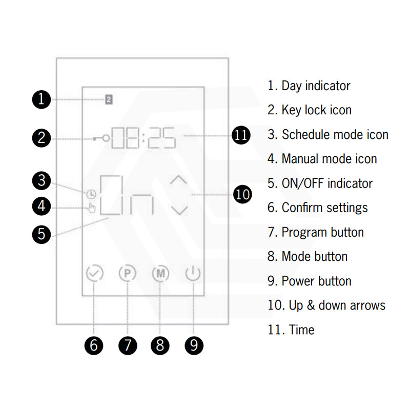 With the TRTS/TRTSB Thermorail Timer, you have the ability to program each day individually or 7 days the same or program weekdays to one schedule and weekends different. This timer has 4 switching times (2on/2off) per day and is simple to program with large easy to read characters. The sleek white/black glass face fits perfectly into the interior of any bathroom.