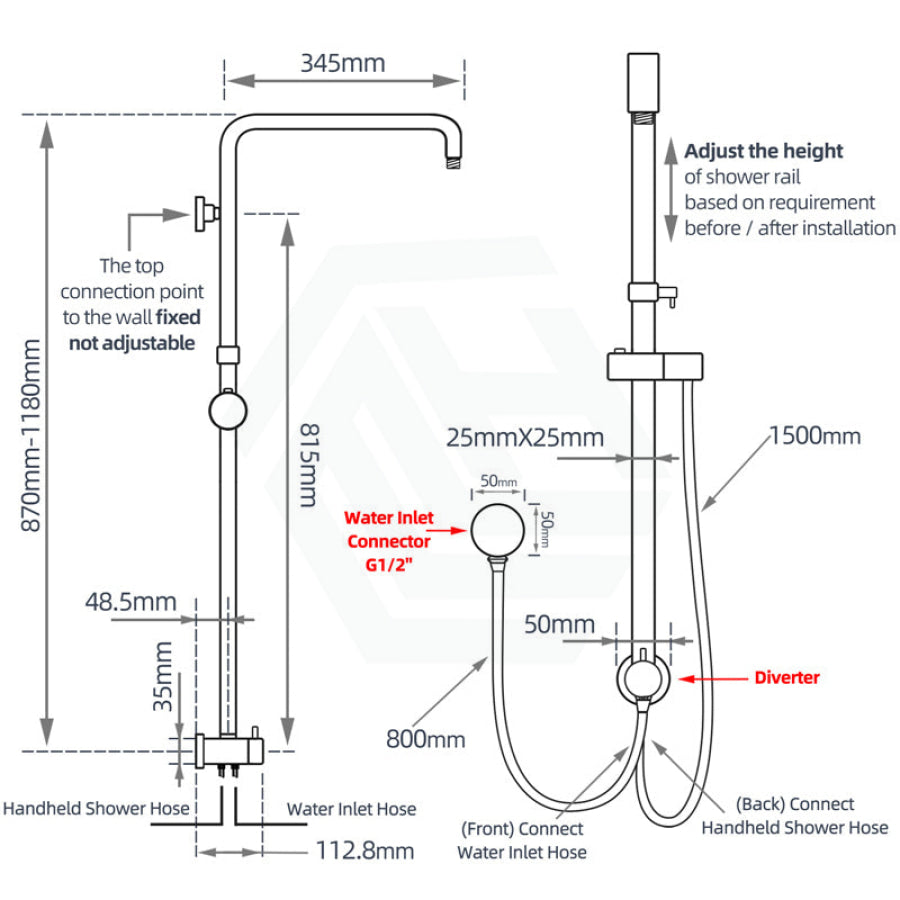 - -The top connection point is 815mm above the diverter