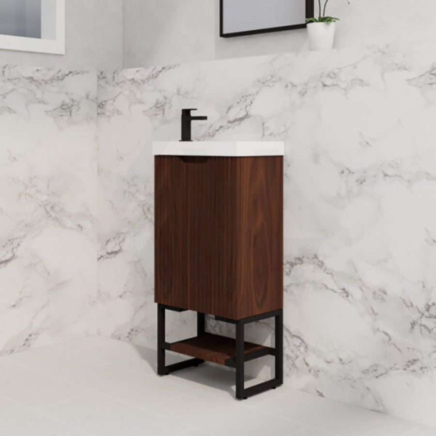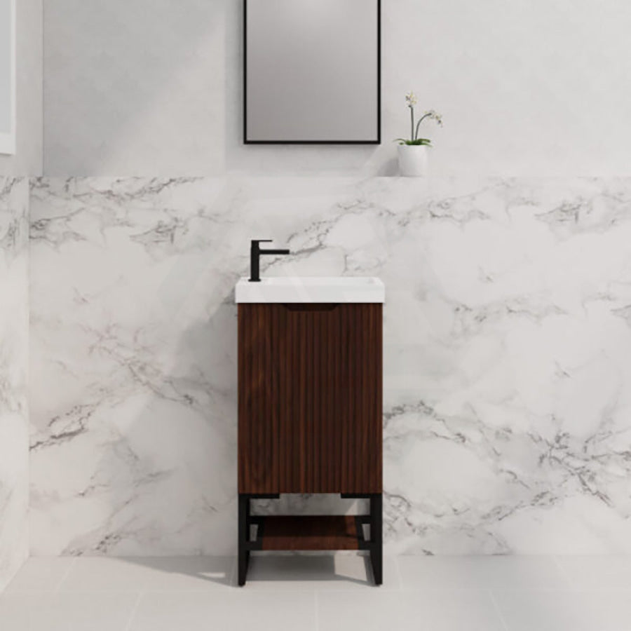 450x250x830mm Vienna Brown Oak Fluted Freestanding One Door Mini Vanity with Overflow Poly Top
