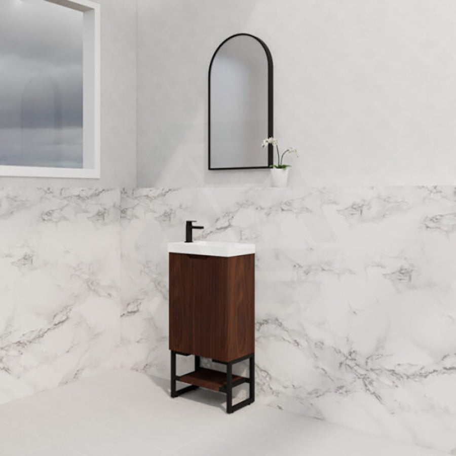 Enhance your bathroom with our 450x250x830mm Vienna Brown Oak Fluted Freestanding Vanity! Featuring a poly top and one door for storage, this mini vanity adds functionality and style to any space. The elegant Vienna Brown Oak finish and fluted design elevate the look of your bathroom.