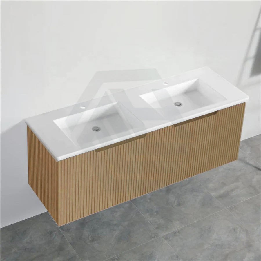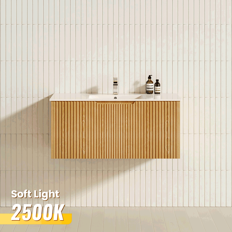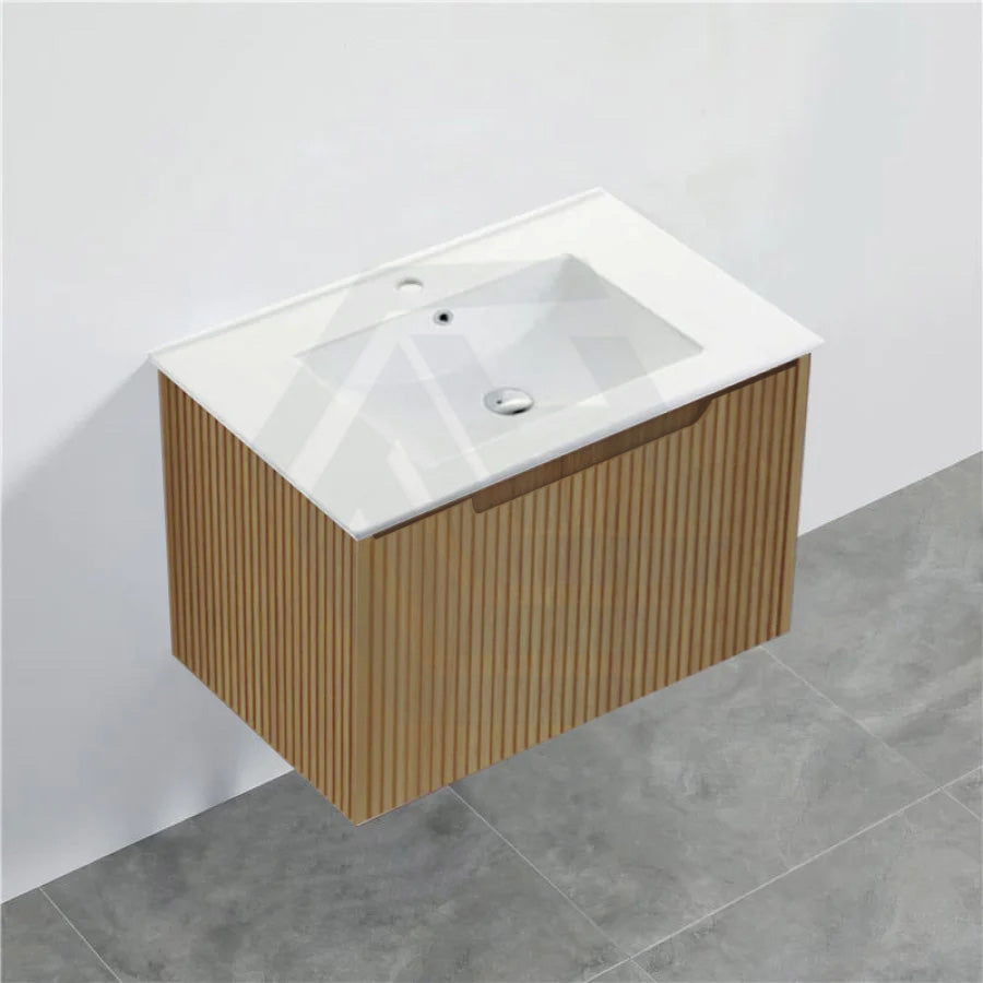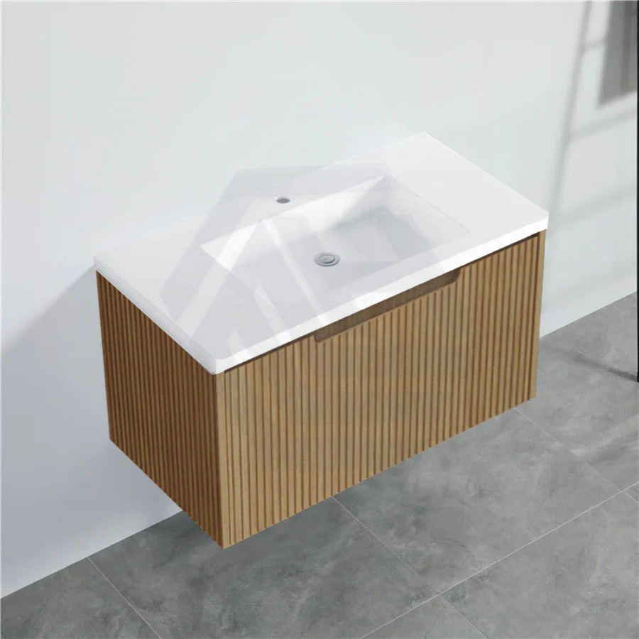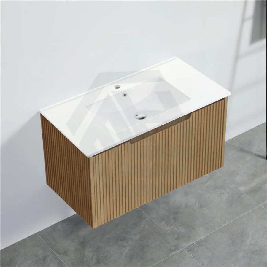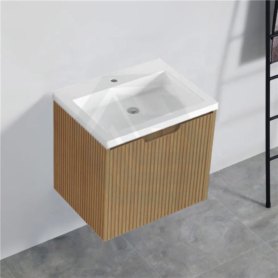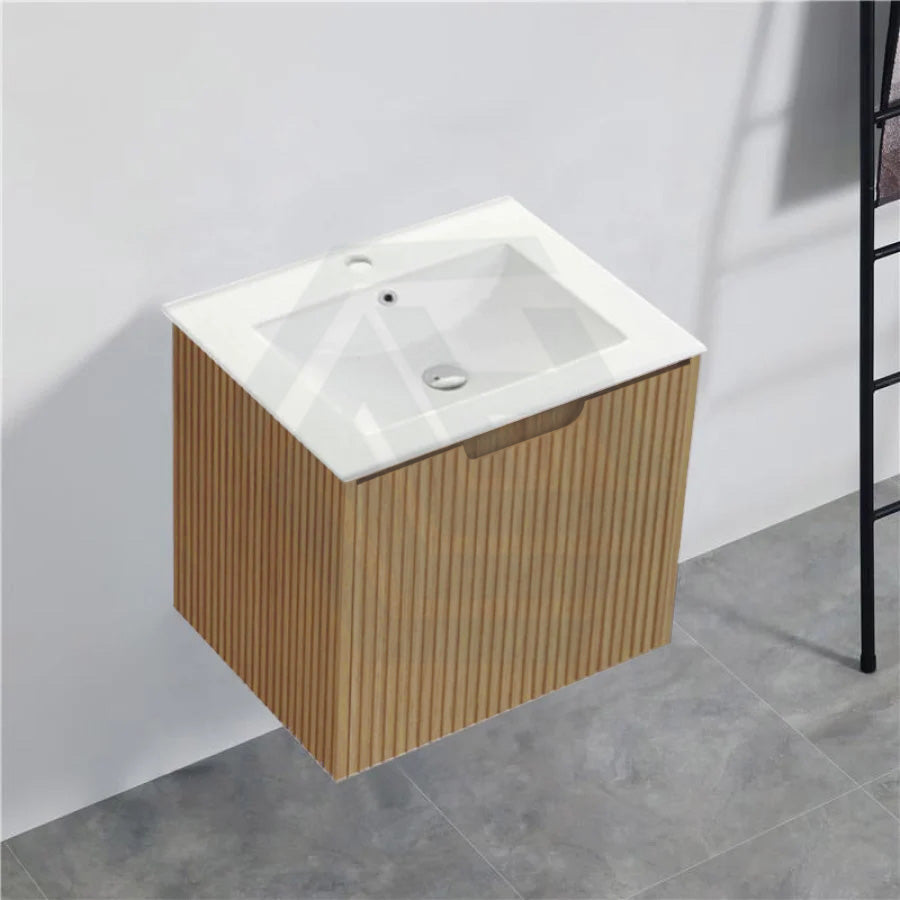 The 600-1500mm Wall Hung Vanity Fluted Style American Oak Color PVC Coating for bathroom or kitchen brings comfort and function together in the bathroom, equipped with soft closing design.