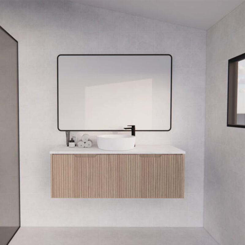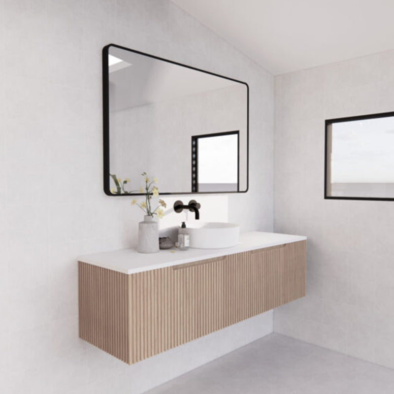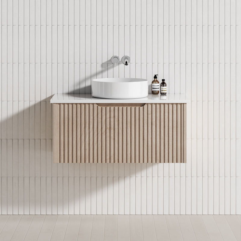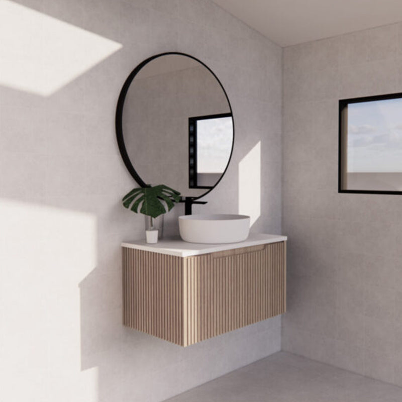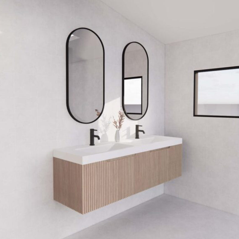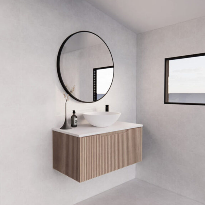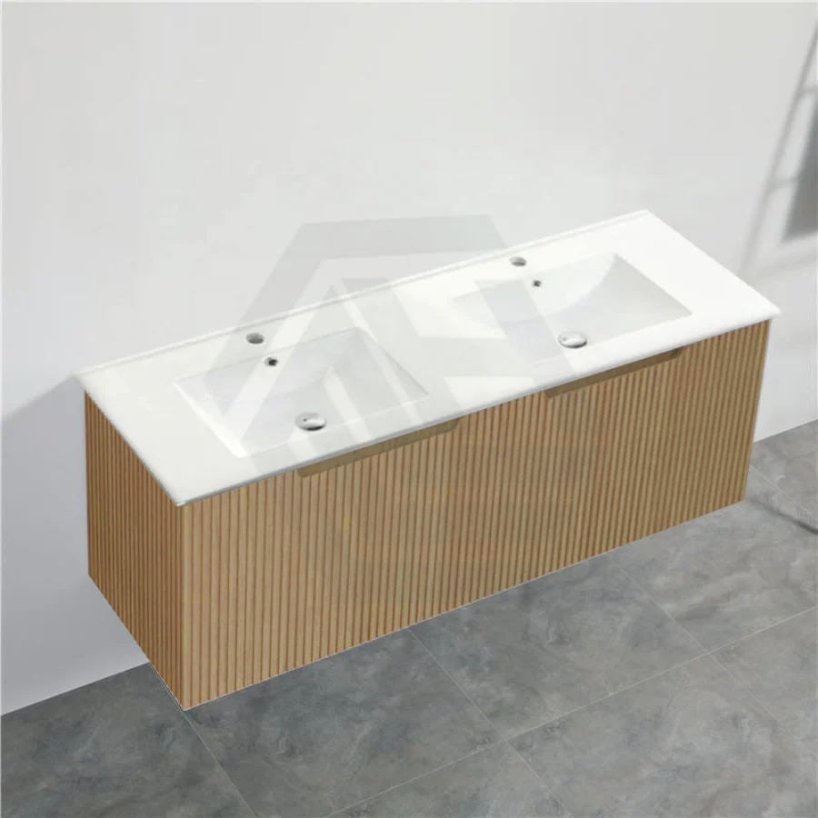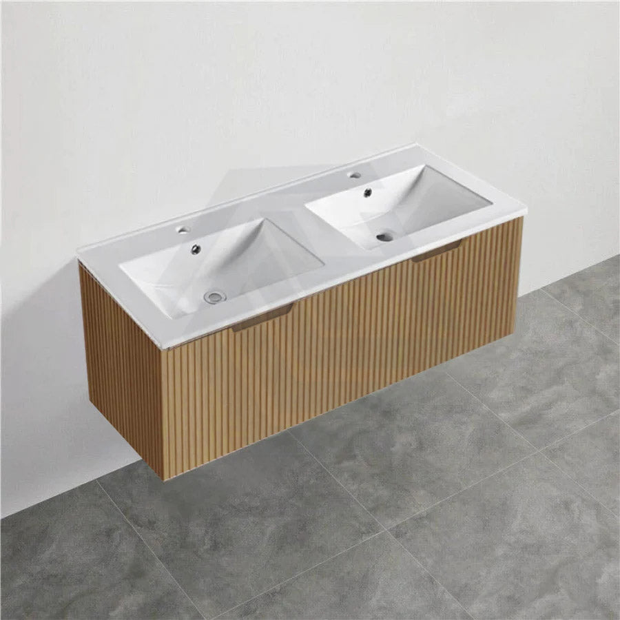 The 600-1500mm Wall Hung Vanity Fluted Style American Oak Color PVC Coating for bathroom or kitchen brings comfort and function together in the bathroom, equipped with soft closing design.