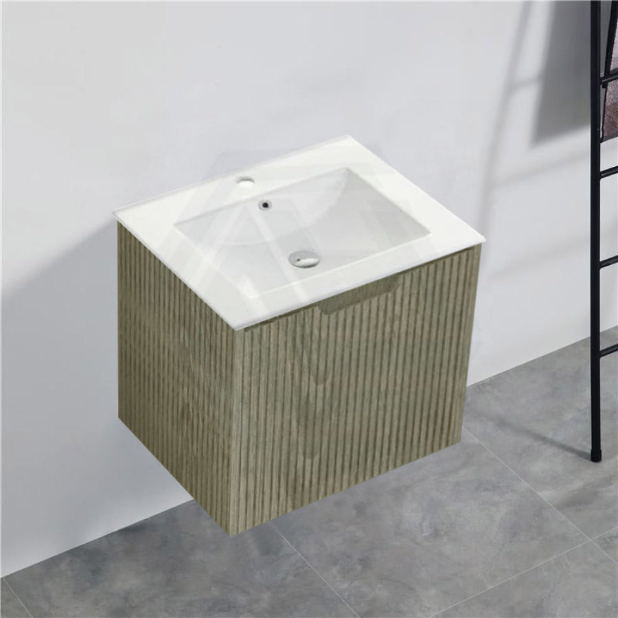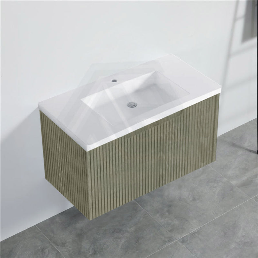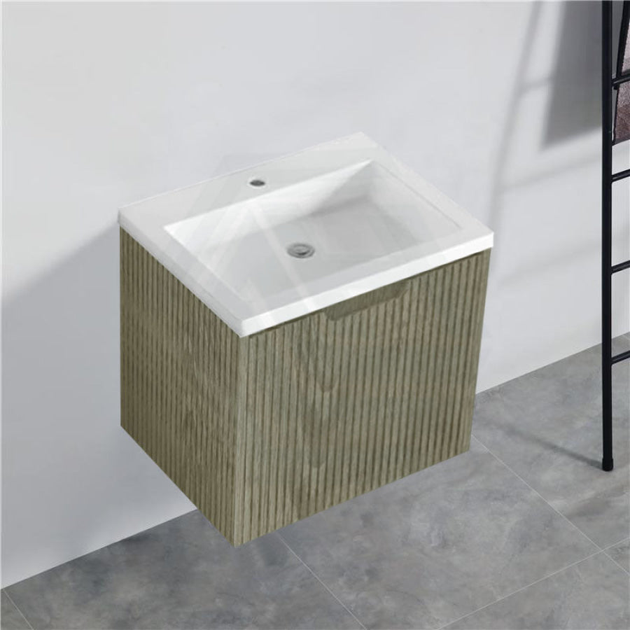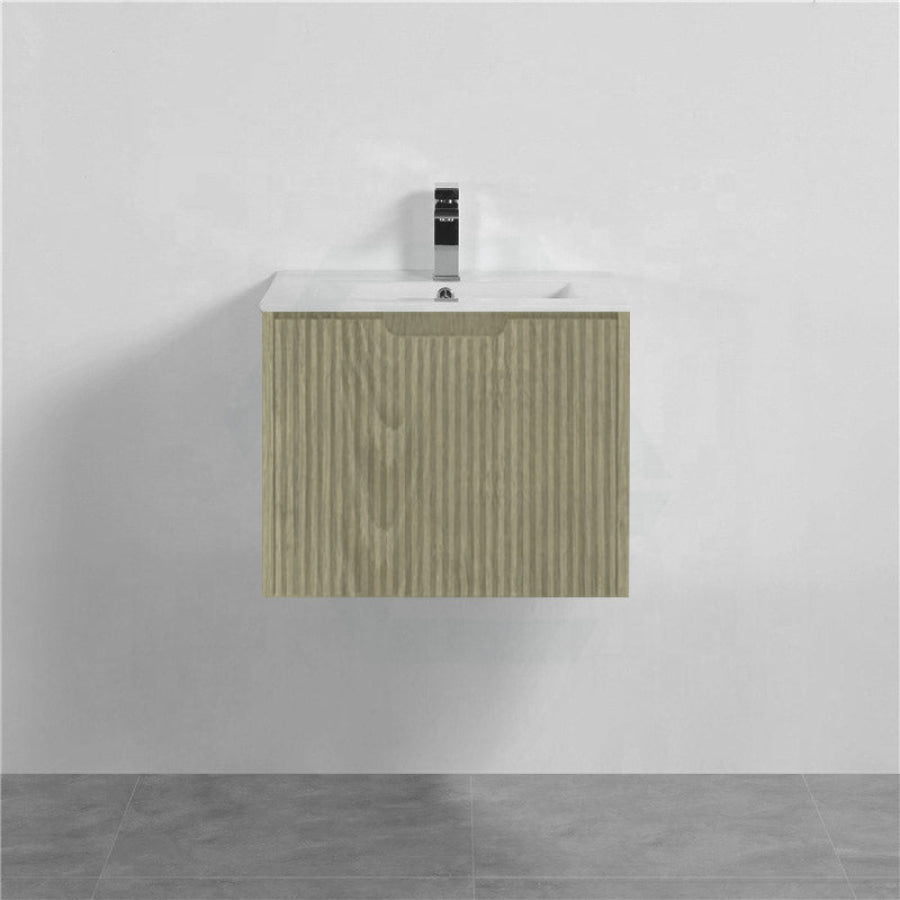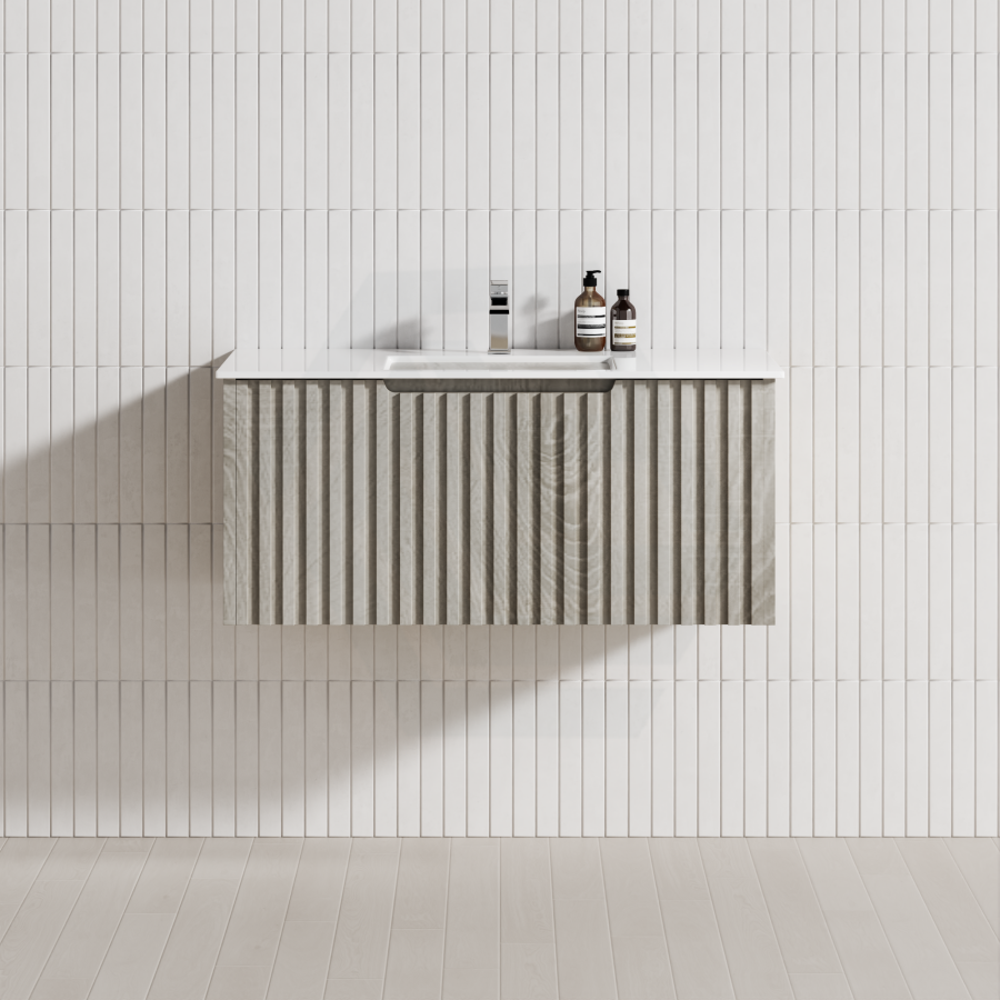 The 600-1500mm Wall Hung Vanity Fluted Style White Oak Color PVC Coating for bathroom or kitchen brings comfort and function together in the bathroom, equipped with soft closing design.