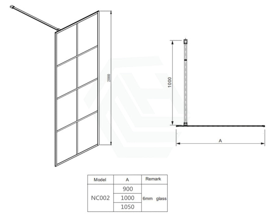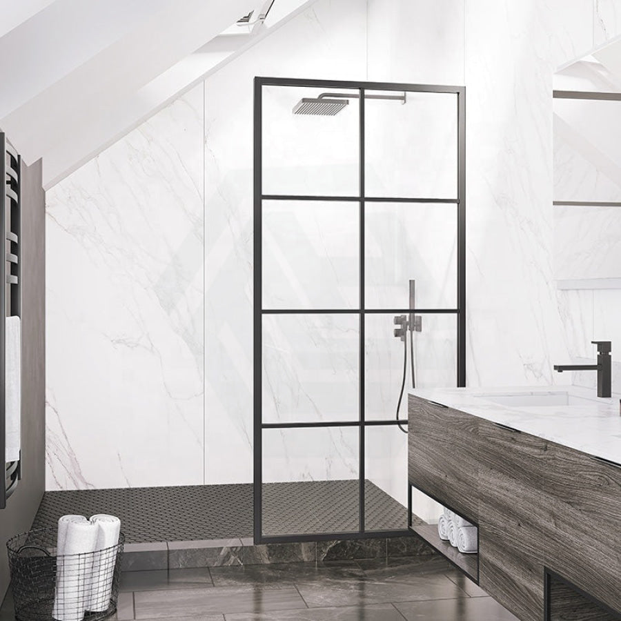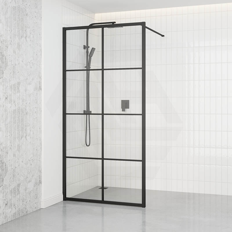 900-1000x2000mm Black Fully Framed Shower Screen Grid Lattice Single Door Fixed Panel Walk-in 6mm Tempered Small Glass
